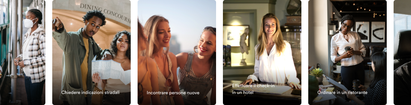 Per spostarti negli aeroporti e negli hotel o per spiegare allergie, chiedere indicazioni stradali e chiacchierare con la gente del posto: il corso di Inglese per Viaggiare copre tutto. Con gli Insegnanti Efekta™, sceglierai cosa vuoi imparare e in poco tempo potrai viaggiare con meno stress e più amici.